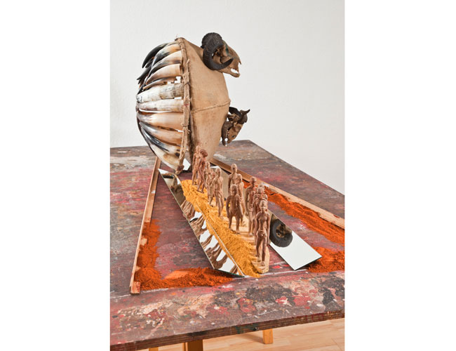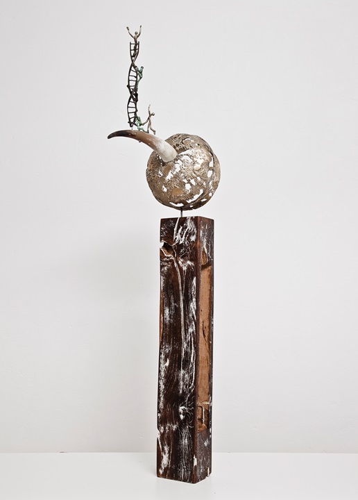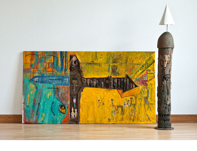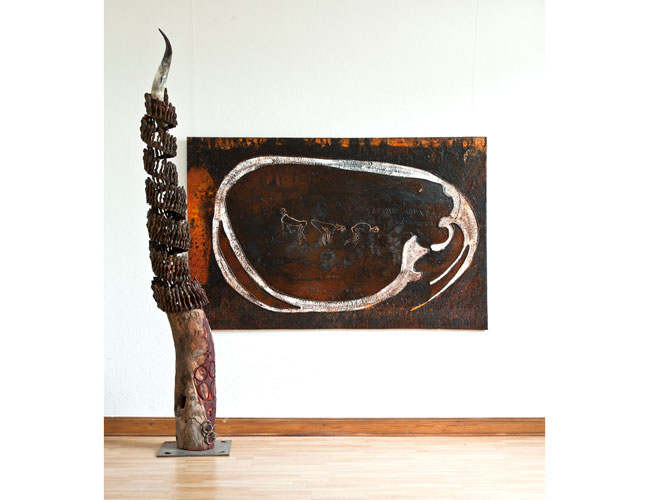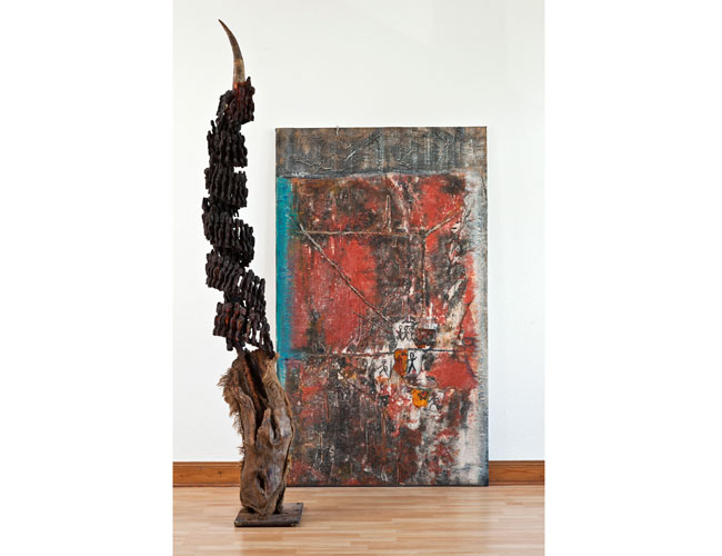 Holzfiguren, Metall, Jute, Horn, Tierschädel, Pigmentfarben, Spiegel,
