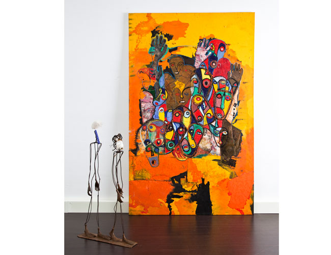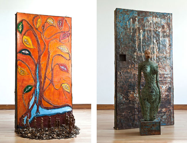 Ölfarbe auf Leinwand, Holzfiguren (183 x 100 cm)